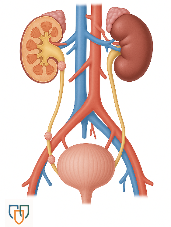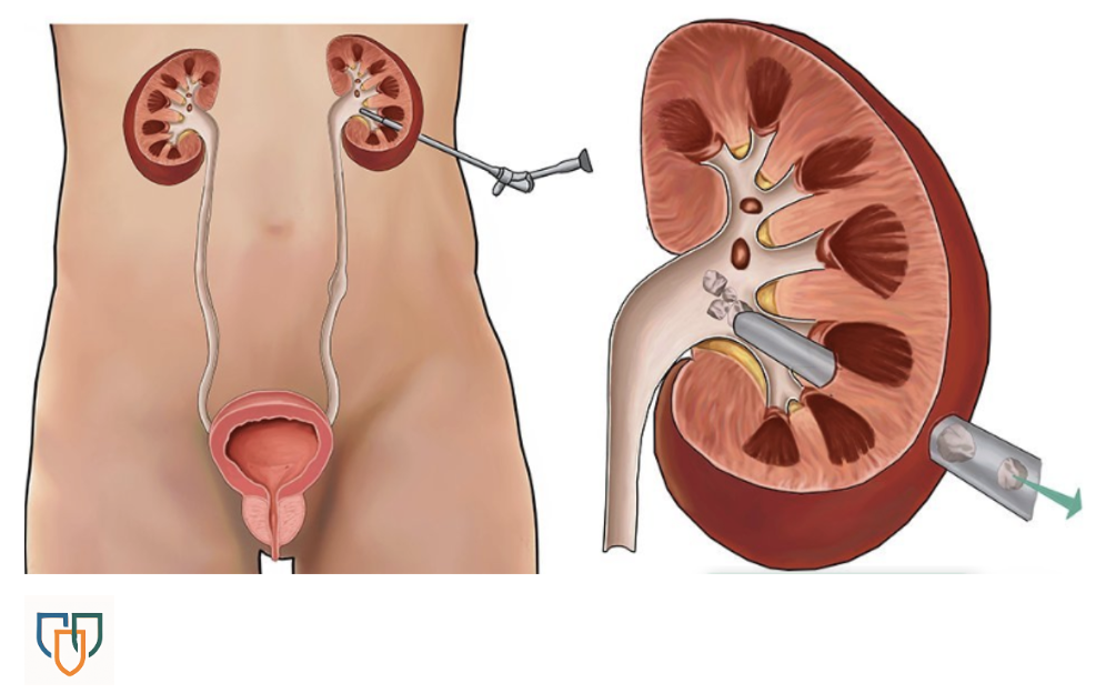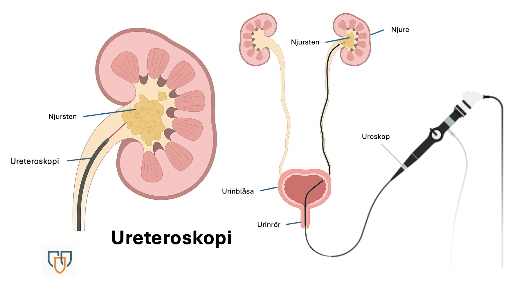 Vid en ureteroskopi förs ett tunt instrument genom urinröret och upp till njuren. Där kan läkaren antingen: